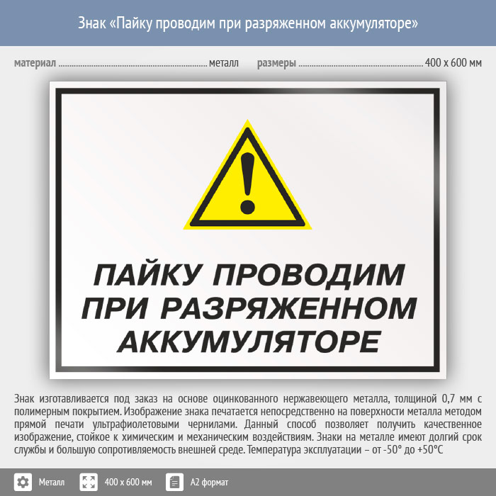 Знак «Пайку проводим при разряженном аккумуляторе», КЗ-62 (металл, 600х400 мм) в Ульяновске купить