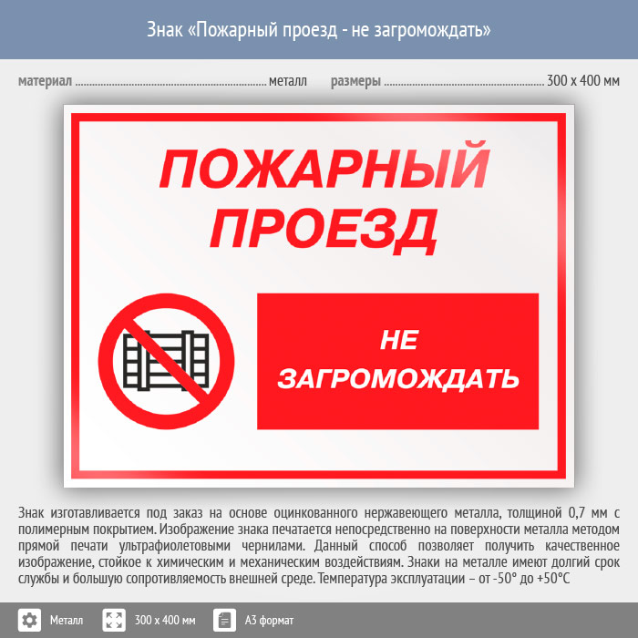 Знак «Пожарный проезд - не загромождать», КЗ-67 (металл, 400х300 мм) в Ульяновске купить