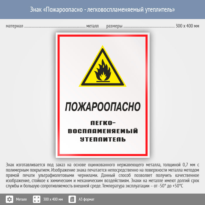 Знак «Пожароопасно - легковоспламеняемый утеплитель», КЗ-68 (металл, 300х400 мм) в Ульяновске купить