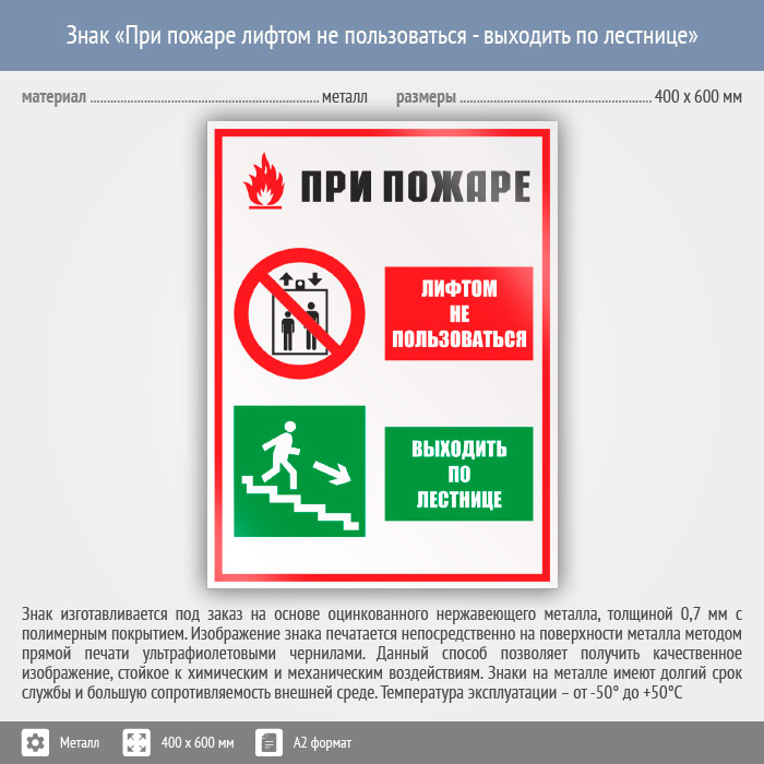Знак «При пожаре лифтом не пользоваться - выходить по лестнице», КЗ-73 (металл, 400х600 мм) в Ульяновске купить