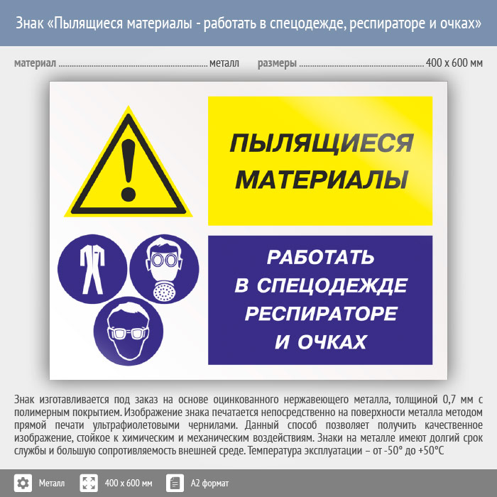 Знак «Пылящиеся материалы - работать в спецодежде, респираторе и очках», КЗ-79 (металл, 600х400 мм) в Ульяновске купить