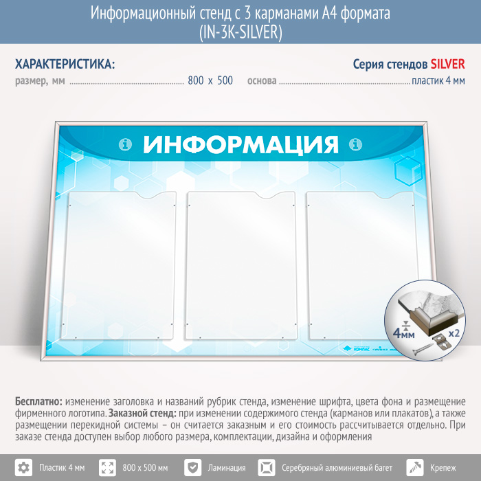Информационный стенд с 3 карманами А4 формата (IN-3K-SILVER) в Ульяновске купить