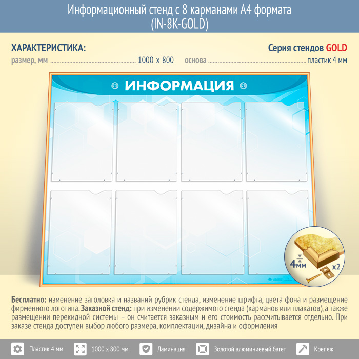 Информационный стенд с 8 карманами А4 формата (IN-8K-GOLD) в Ульяновске купить