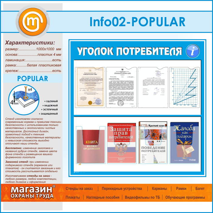 Стенд «Уголок потребителя» с 4 плоскими и 4 объемными карманами А4 формата (IN-02-POPULAR) в Ульяновске купить