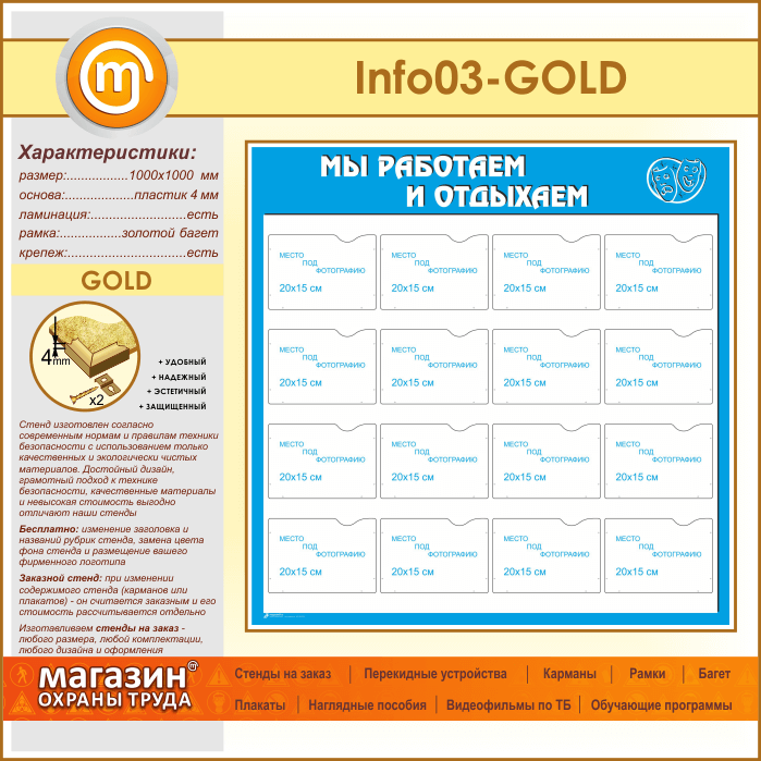 Стенд «Мы работаем и отдыхаем» с 16 карманами А5 формата (IN-03-GOLD) в Ульяновске купить