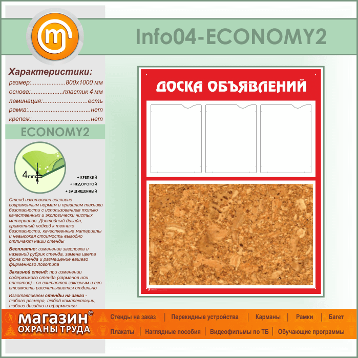 Стенд «Доска объявлений» с пробковым полотном и 3 карманами А4 формата (IN-04-ECONOMY2) в Ульяновске купить