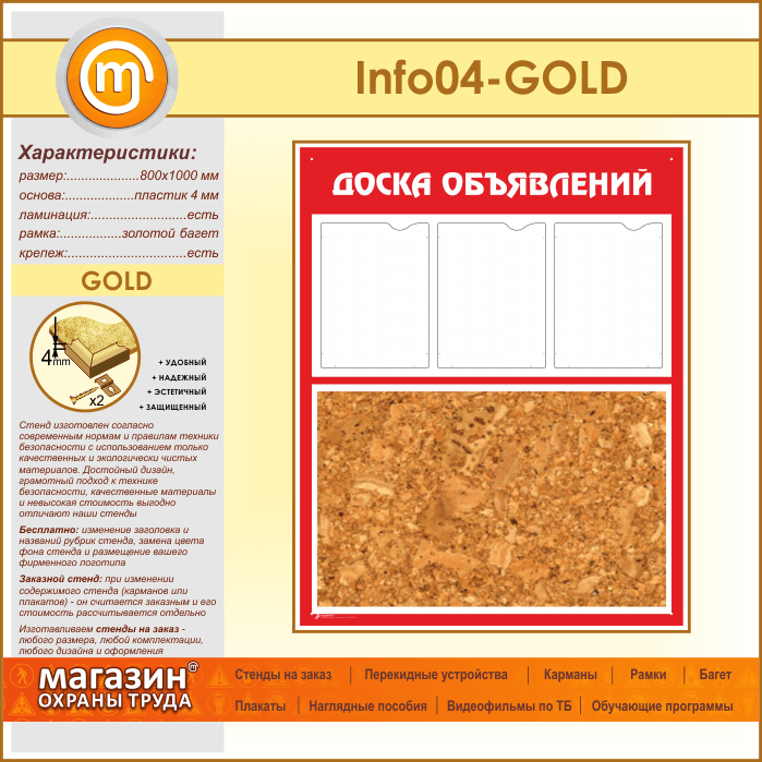 Стенд «Доска объявлений» с пробковым полотном и 3 карманами А4 формата (IN-04-GOLD) в Ульяновске купить