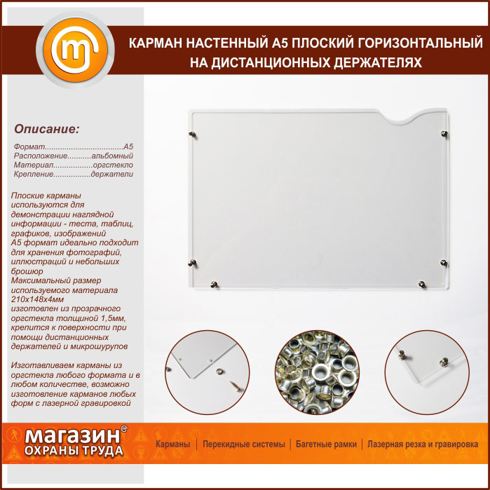Карман настенный А5 плоский горизонтальный на дистанционных держателях