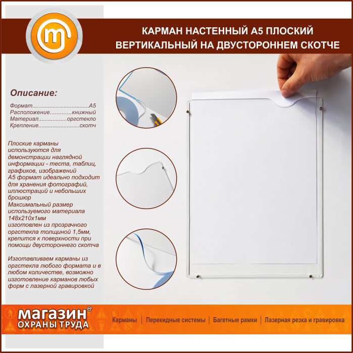 Карман настенный А5 плоский вертикальный на двустороннем скотче в Ульяновске купить