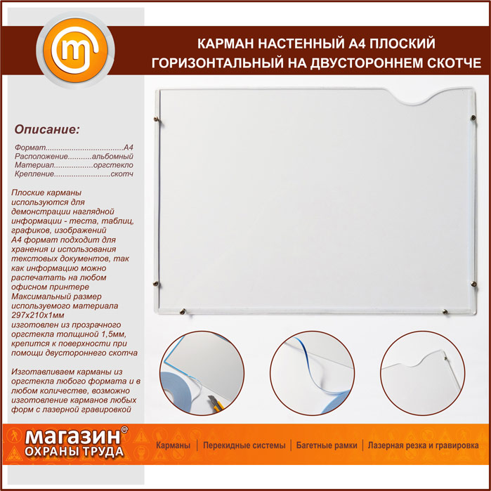 Карман настенный А4 плоский горизонтальный на двустороннем скотче в Ульяновске купить