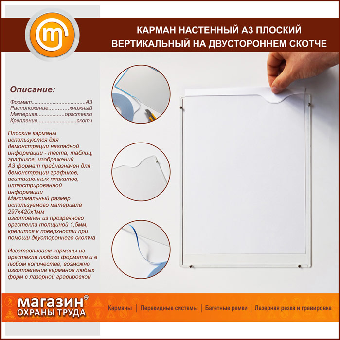 Карман настенный А3 плоский вертикальный на двустороннем скотче в Ульяновске купить