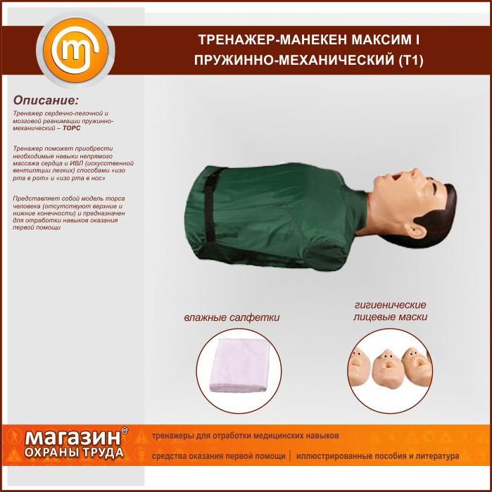 | Тренажер сердечно-легочной и мозговой реанимации «Максим I-01», Т10 В/Р (пружинно-механический, манекен) | Тренажер сердечно-легочной и мозговой реанимации «Максим I-01», Т10 В/Р (пружинно-механический, манекен) |