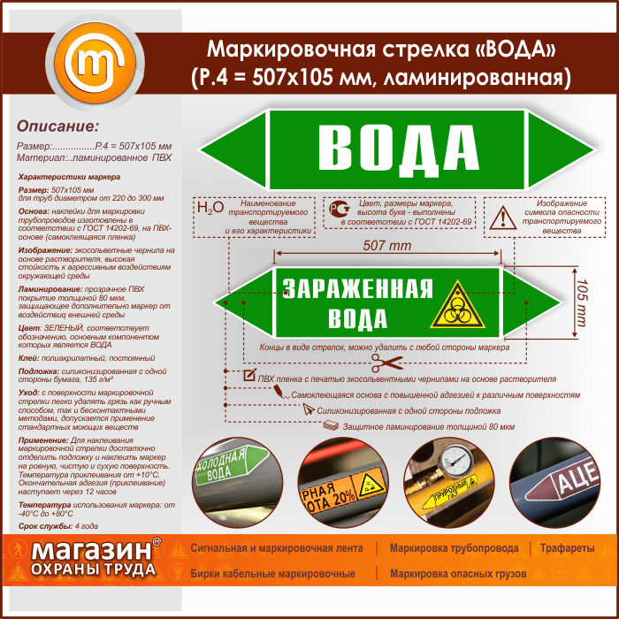 Маркировочная стрелка «ВОДА» (P.4 = 507х105 мм, самоклеящаяся плёнка с ламинированием) в Ульяновске купить