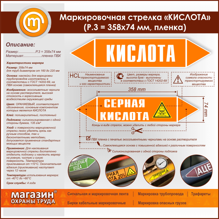 Маркировочная стрелка «КИСЛОТА» (P.3 = 358х74 мм, самоклеящаяся плёнка) в Ульяновске купить