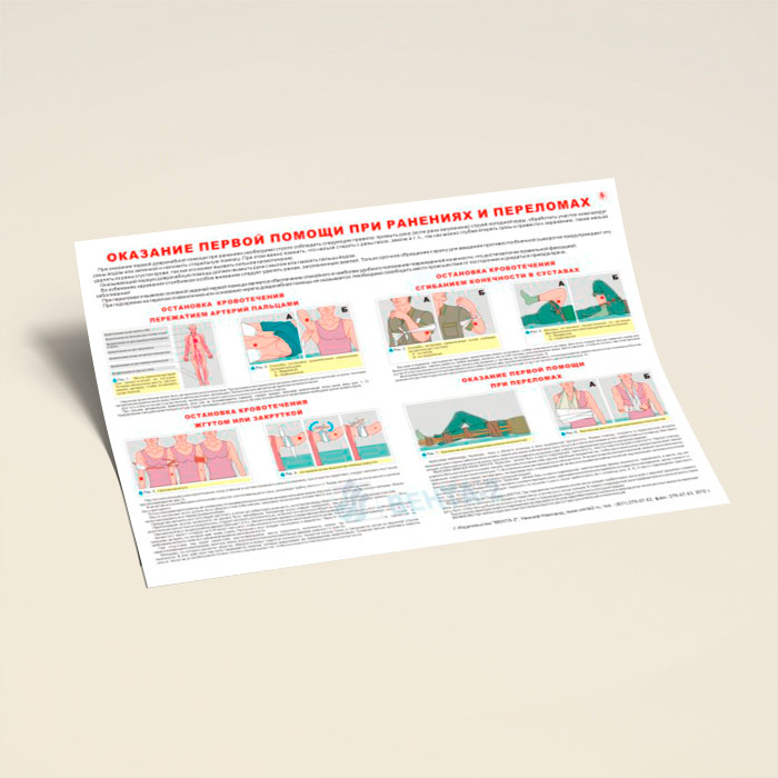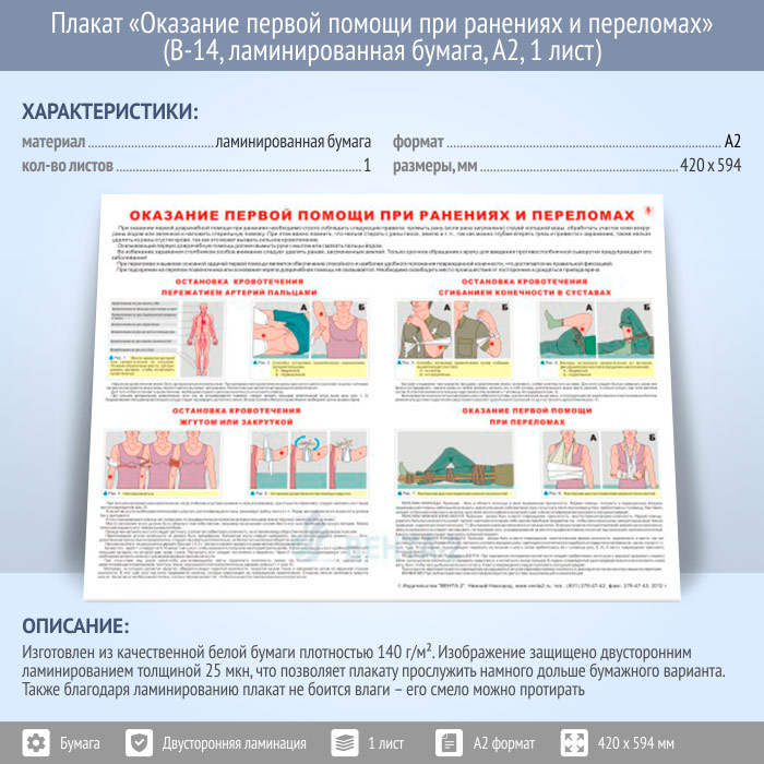 Плакат «Оказание первой помощи при ранениях и переломах» (В-14, ламинированная бумага, А2, 1 лист) в Ульяновске купить