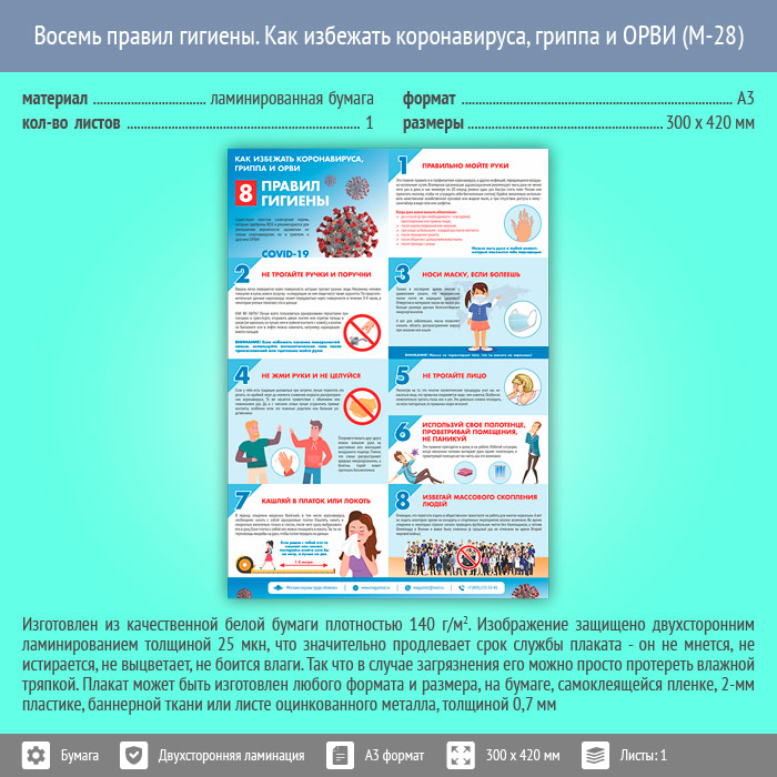 Плакат «Восемь правил гигиены. Как избежать коронавируса, гриппа и ОРВИ» (М-28, ламинированная бумага, А3, 1 лист) в Ульяновске купить