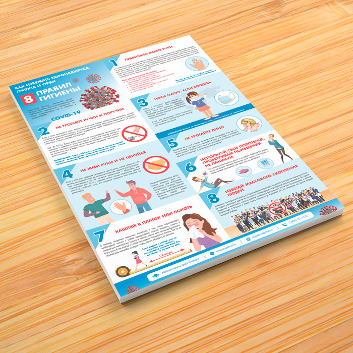 Плакат «Восемь правил гигиены. Как избежать коронавируса, гриппа и ОРВИ» (М-28, ламинированная бумага, А2, 1 лист) в Ульяновске купить