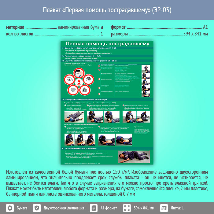 Плакат «Первая помощь пострадавшему» (ЭР-03, ламинированная бумага, А1, 1 лист) в Ульяновске купить