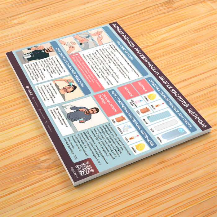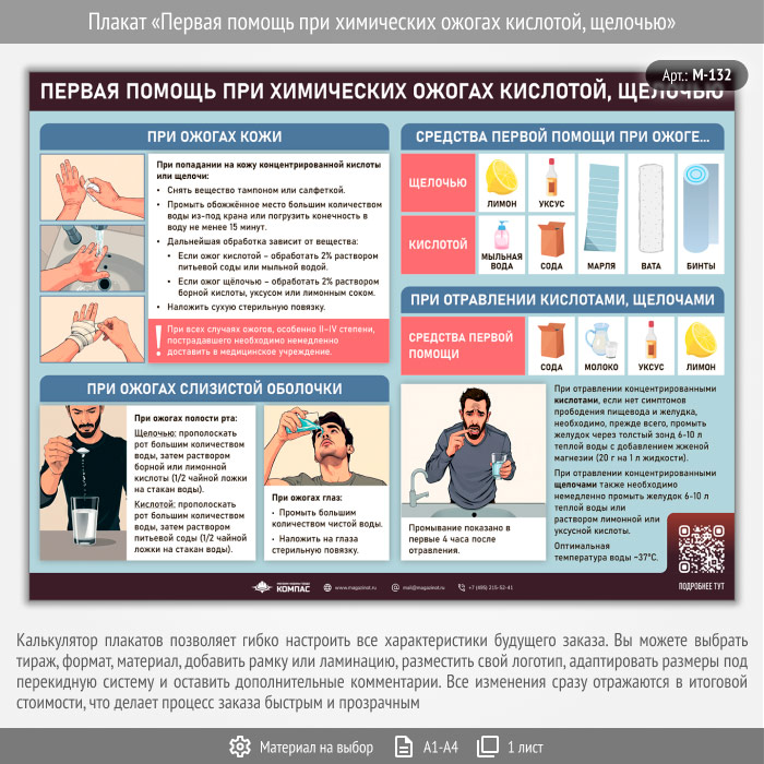Плакат «Первая помощь при химических ожогах кислотой, щелочью» с QR (М-132, 1 лист) в Ульяновске купить