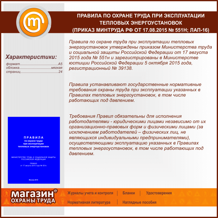 Правила по охране труда при эксплуатации тепловых энергоустановок (Приказ Минтруда РФ от 17.08.2015 № 551н) (ЛАП-16) в Ульяновске купить
