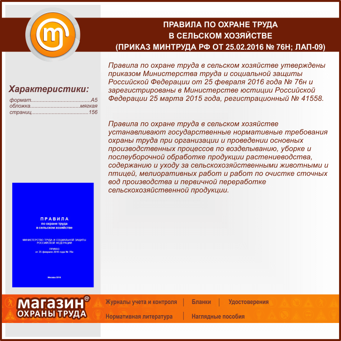 Правила по охране труда в сельском хозяйстве (Приказ Минтруда РФ от 25.02.2016 № 76н) (ЛАП-09) в Ульяновске купить
