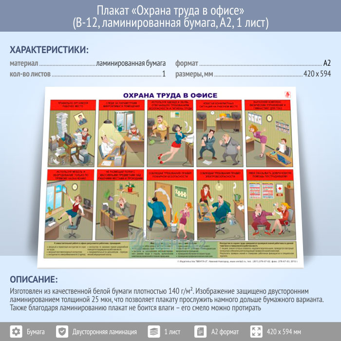 Плакат «Охрана труда в офисе» (В-12, ламинированная бумага, А2, 1 лист) в Ульяновске купить