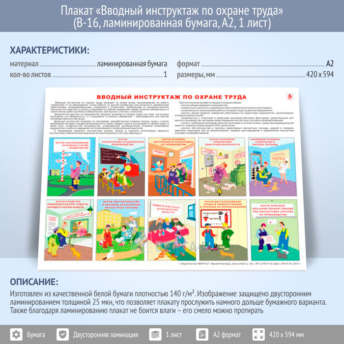 Плакат «Вводный инструктаж по охране труда» (В-16, ламинированная бумага, А2, 1 лист) в Ульяновске купить