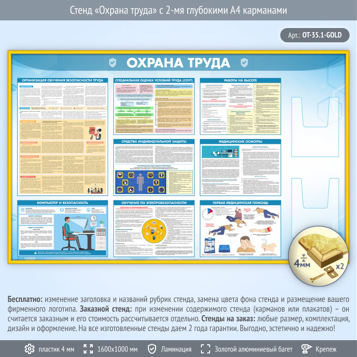 Стенд «Охрана труда» с 2-мя глубокими А4 карманами (OT-35.1-GOLD) в Ульяновске купить
