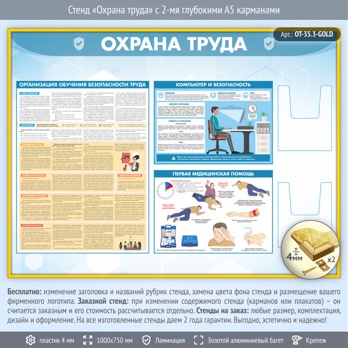 Стенд «Охрана труда» с 2-мя глубокими А5 карманами (OT-35.3-GOLD) в Ульяновске купить