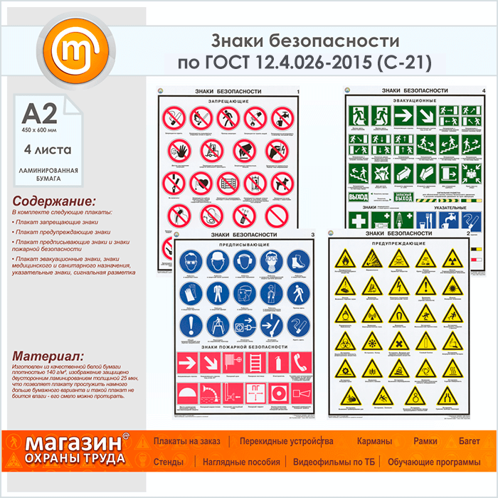 Плакаты «Знаки безопасности по ГОСТ 12.4.026-2015» (С-21, ламинированная бумага, А2, 4 листа) в Ульяновске купить