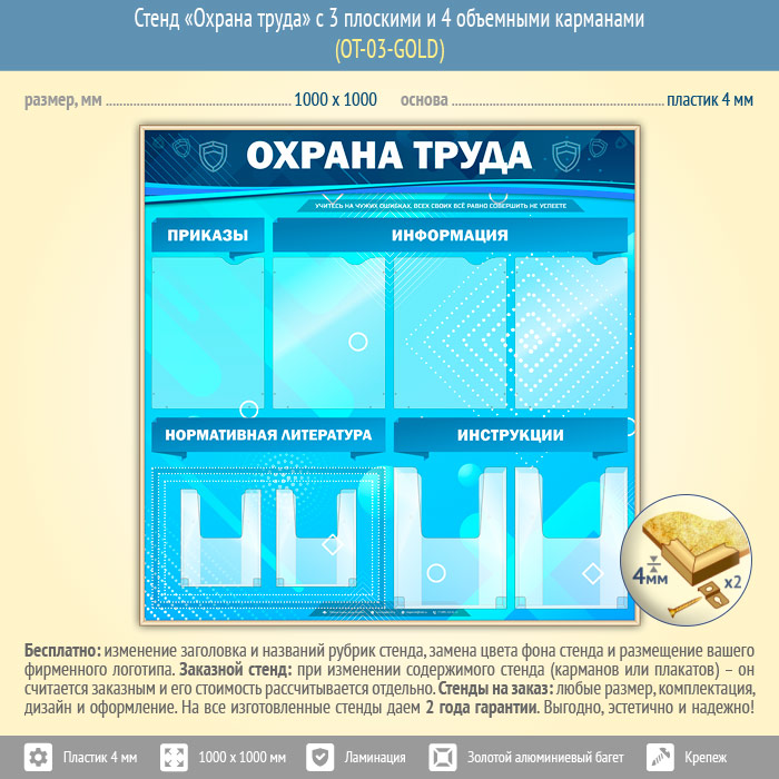 Стенд «Охрана труда» с 4 плоскими и 4 объемными карманами (OT-03-GOLD) в Ульяновске купить