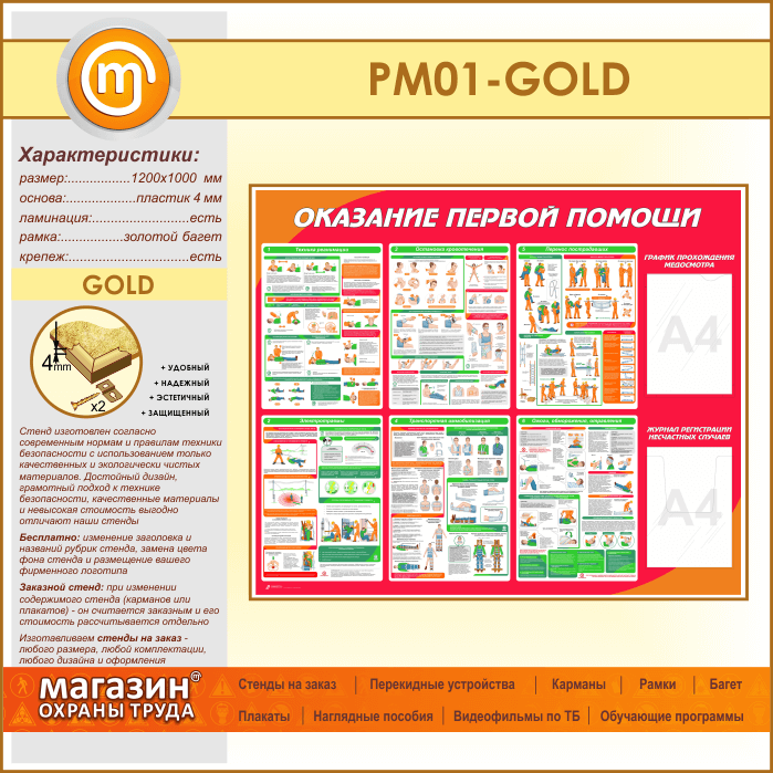 Стенд «Оказание первой помощи» с плоским и объемным карманами (PM-01-GOLD) в Ульяновске купить