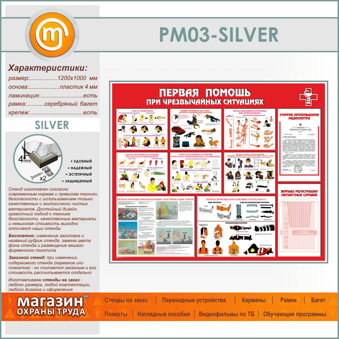 Стенд «Первая помощь при чрезвычайных ситуациях» с плоским и объемным карманами (PM-03-SILVER) в Ульяновске купить