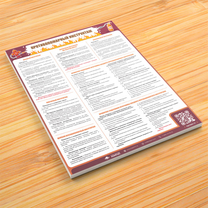 Также у нас Вы найдете буклет-памятку «Противопожарный инструктаж», которая содержит всю ту же информацию, что и плакат, но в более компакном виде. Такой буклет удобно взять с собой и ознакомиться с ним в удобное время и в удобном месте