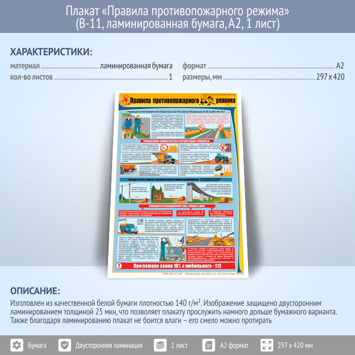 Плакат «Правила противопожарного режима» (В-11, ламинированная бумага, А2, 1 лист) в Ульяновске купить
