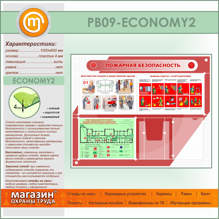 Стенд «Пожарная безопасность» с планом эвакуации, плоским и объемным карманами (PB-09-ECONOMY2) в Ульяновске купить