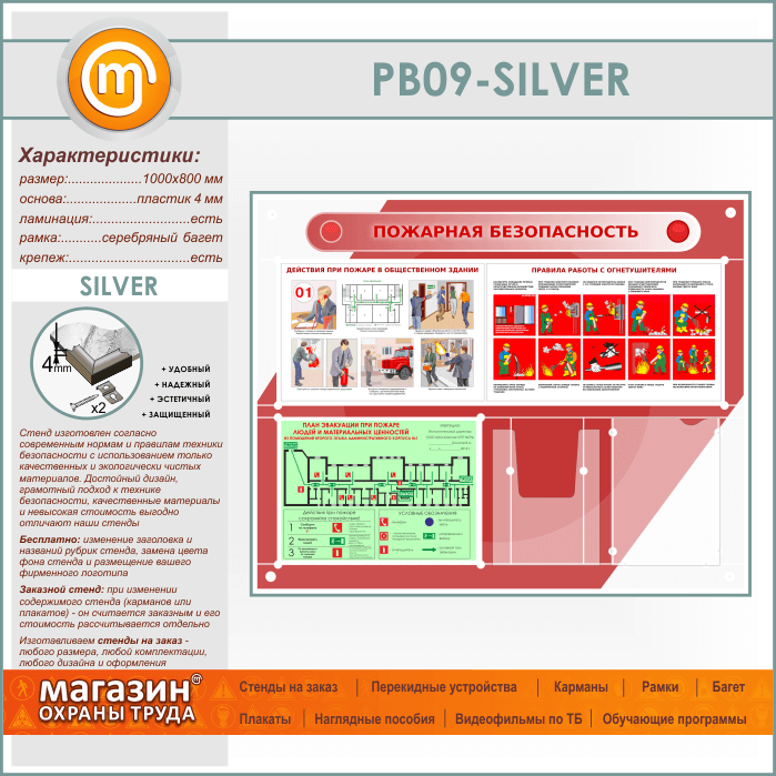 Стенд «Пожарная безопасность» с планом эвакуации, плоским и объемным карманами (PB-09-SILVER) в Ульяновске купить