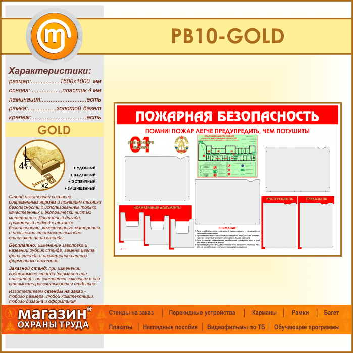 Стенд «Пожарная безопасность» с планом эвакуации, 5 плоскими и 3 объемными карманами (PB-10-GOLD) в Ульяновске купить