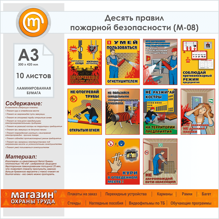 Плакаты «Десять правил пожарной безопасности» (М-08, ламинированная бумага, А3, 10 листов) в Ульяновске купить