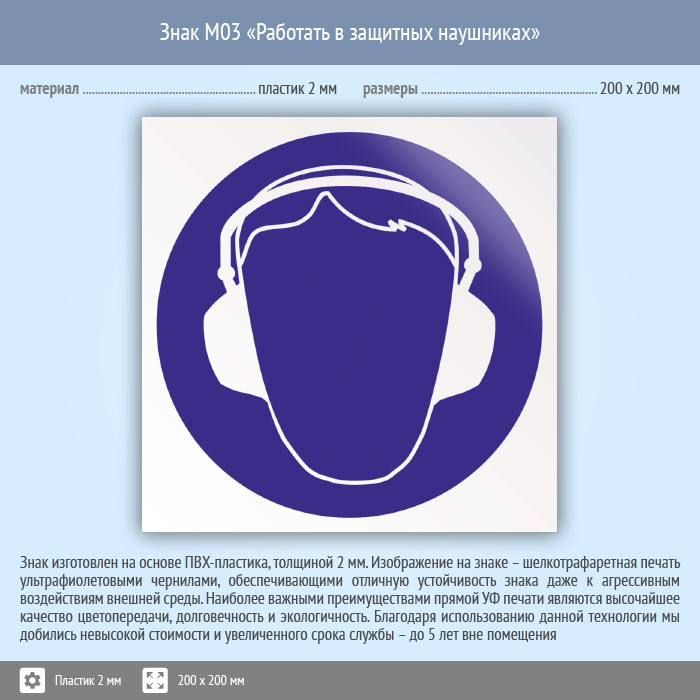 Знак M03 «Работать в защитных наушниках» (пластик, 200х200 мм) в Ульяновске купить