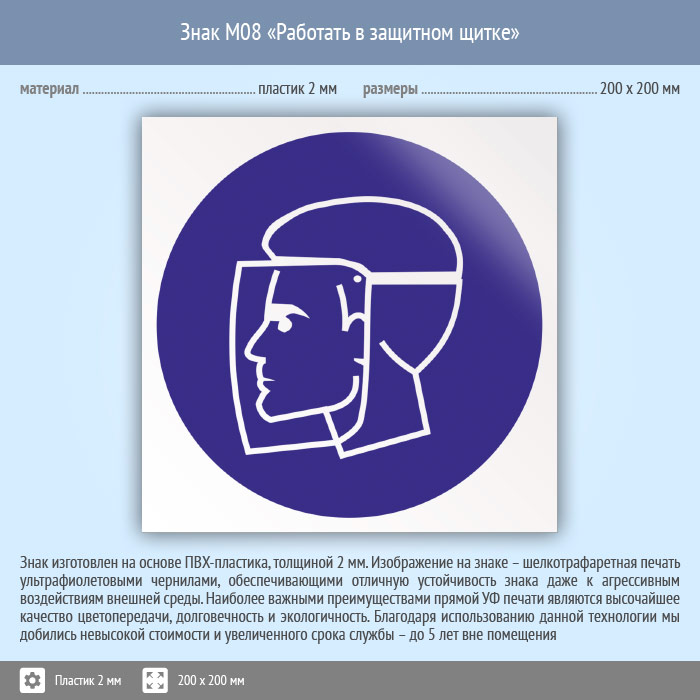 Знак M08 «Работать в защитном щитке» (пластик, 200х200 мм) в Ульяновске купить