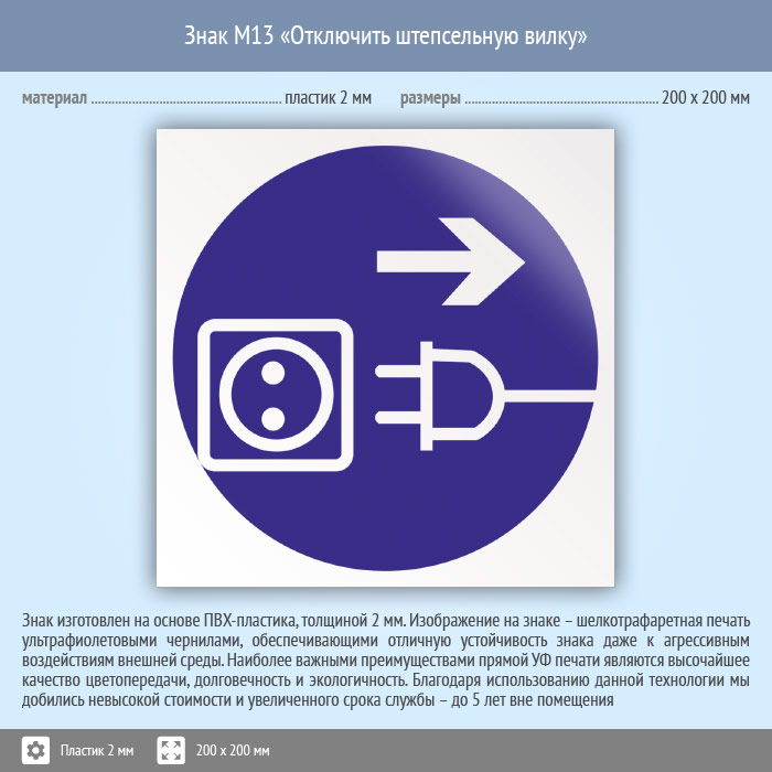 Знак M13 «Отключить штепсельную вилку» (пластик, 200х200 мм) в Ульяновске купить