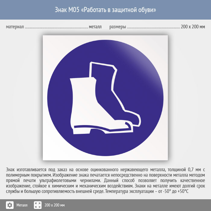 Знак M05 «Работать в защитной обуви» (металл, 200х200 мм) в Ульяновске купить