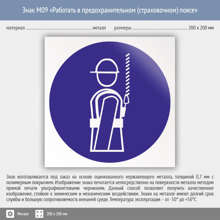 Знак M09 «Работать в предохранительном (страховочном) поясе» (металл, 200х200 мм) в Ульяновске купить