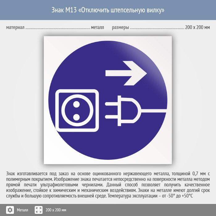 Знак M13 «Отключить штепсельную вилку» (металл, 200х200 мм) в Ульяновске купить