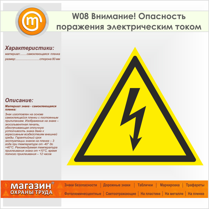 Знак W08 «Внимание! опасность поражения электрическим током» (пленка, сторона 80 мм) в Ульяновске купить