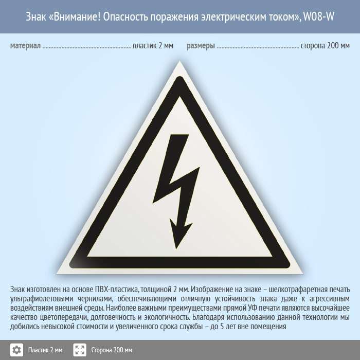 Знак W08-W «Внимание! опасность поражения электрическим током» (белый, пластик, сторона 200 мм) в Ульяновске купить