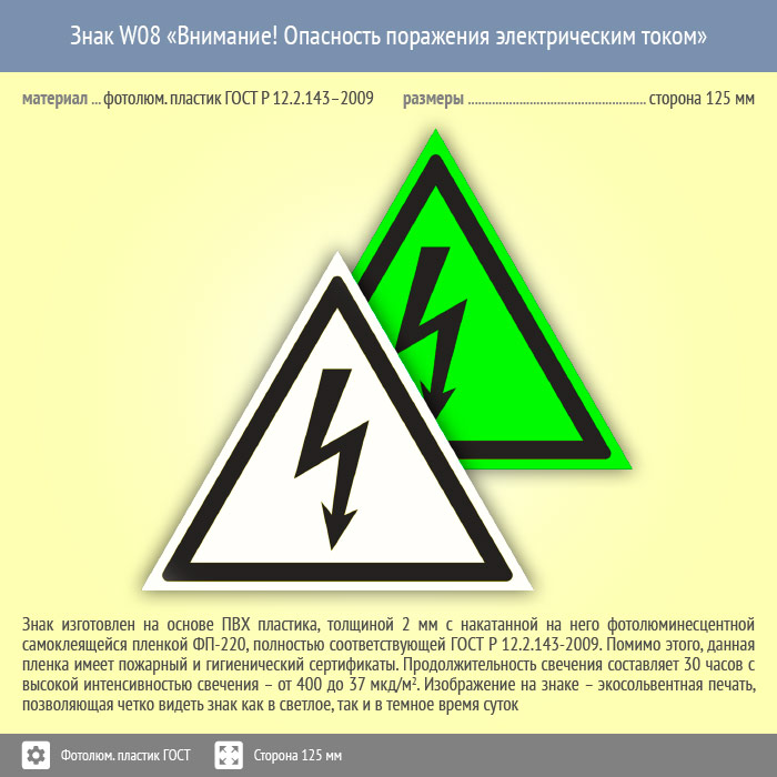 Знак W08 «Внимание! Опасность поражения электрическим током» (фотолюминесцентный пластик ГОСТ 34428-2018, сторона 125 мм) в Ульяновске купить