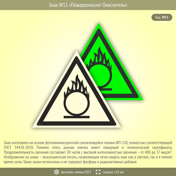 Знак W11 «Пожароопасно! окислитель» (фотолюминесцентная пленка ГОСТ 34428-2018, сторона 150 мм) в Ульяновске купить