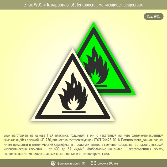 Знак W01 «Пожароопасно! Легковоспламеняющиеся вещества» (фотолюминесцентный пластик ГОСТ 34428-2018, сторона 100 мм) в Ульяновске купить